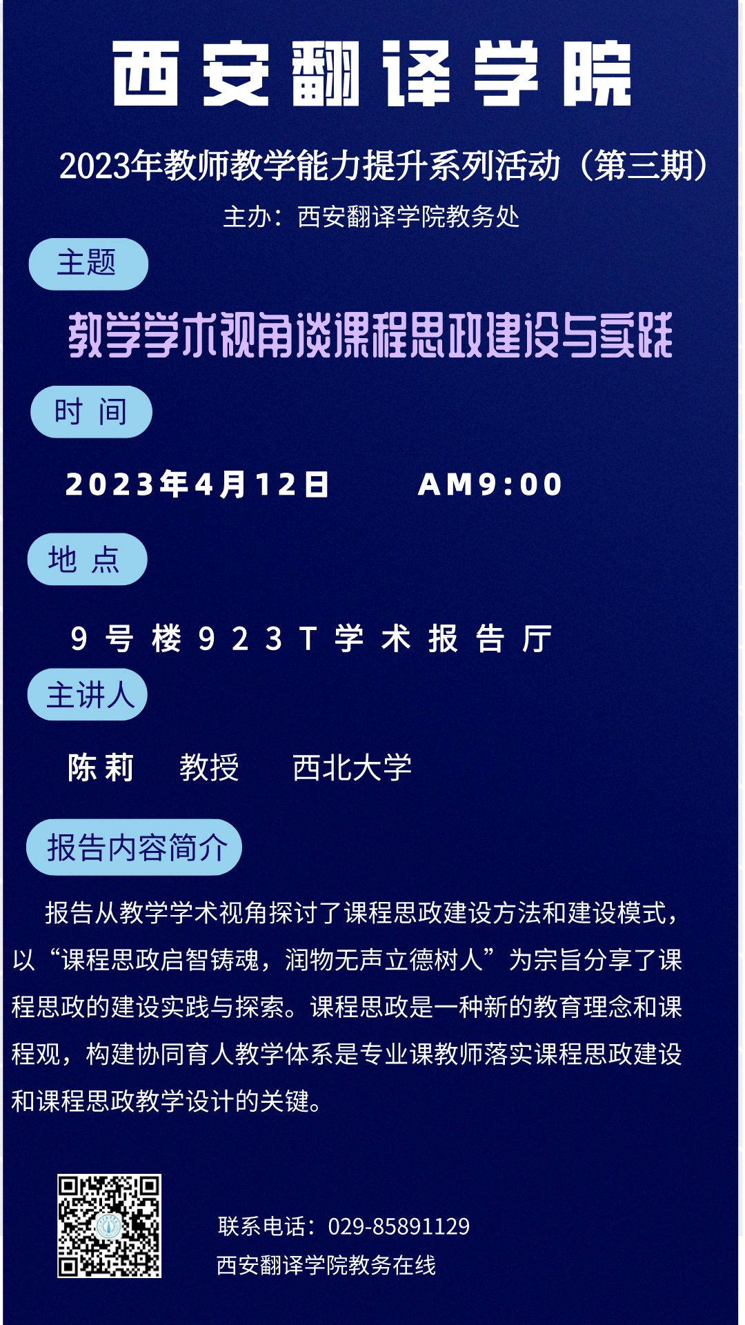 4月13日上午9:00,教务处在923T学术报告厅举办教师教学能力提升系列活动第三期。本期活动邀请了西北大学陈莉教授作“教学学术视角谈课程思政建设与实践”主题讲座。讲座由教务处副处长孙晓辉主持。