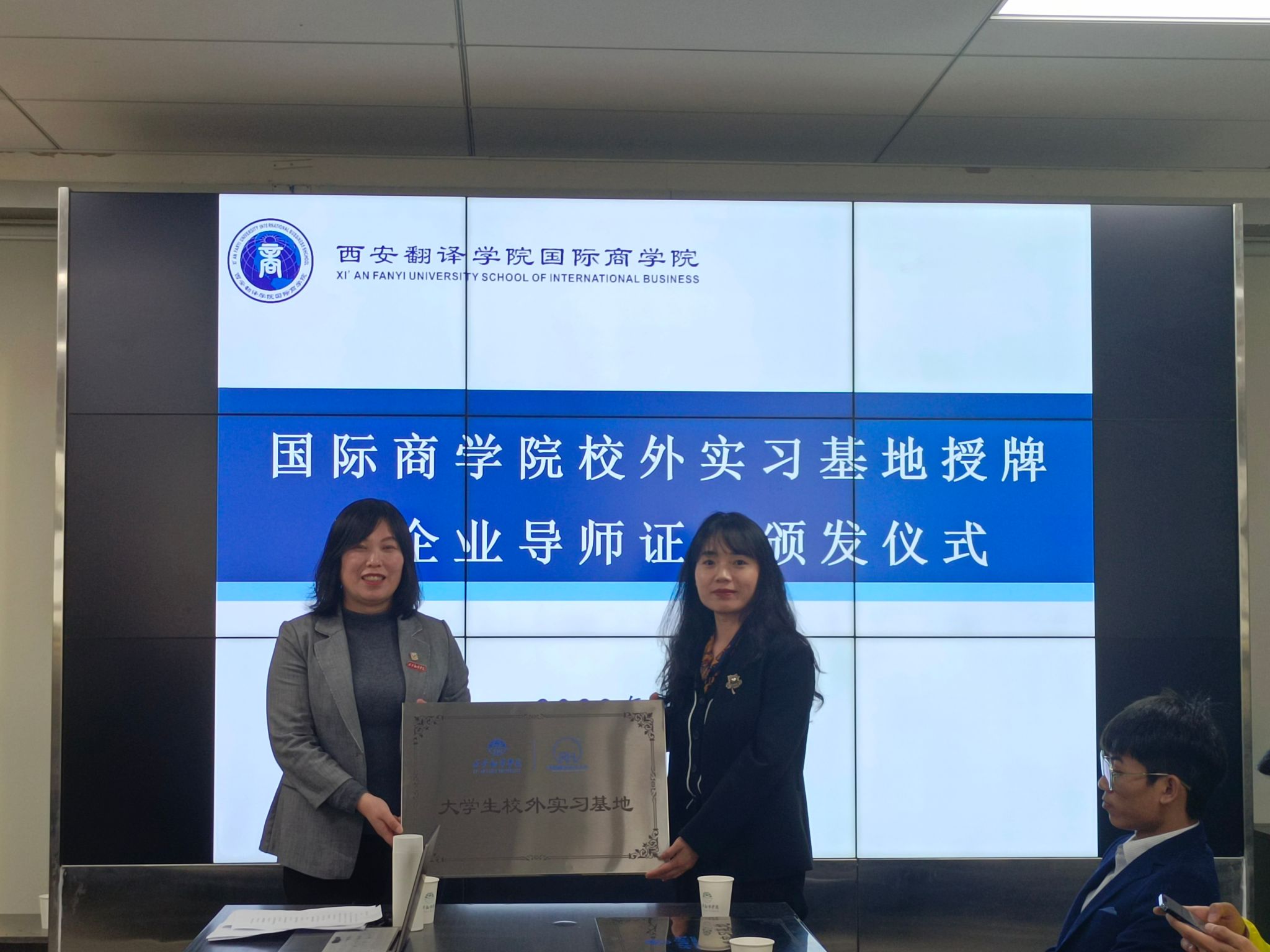 讲座结束后,国际商学院举办了校外实习基地授牌仪式和企业导师证书颁发仪式。马祯代表国际商学院为企业合作方——陕西睿恒资产评估有限责任公司授予校外实习基地牌匾,并为陕西睿恒资产评估有限责任公司理事长赵琦颁发企业导师聘书。