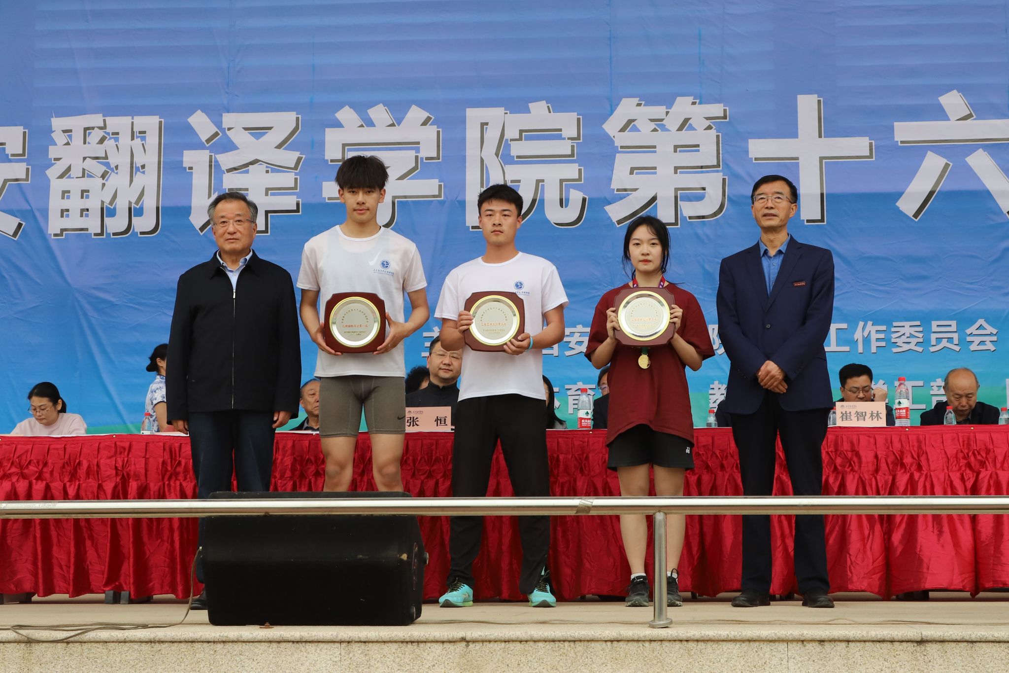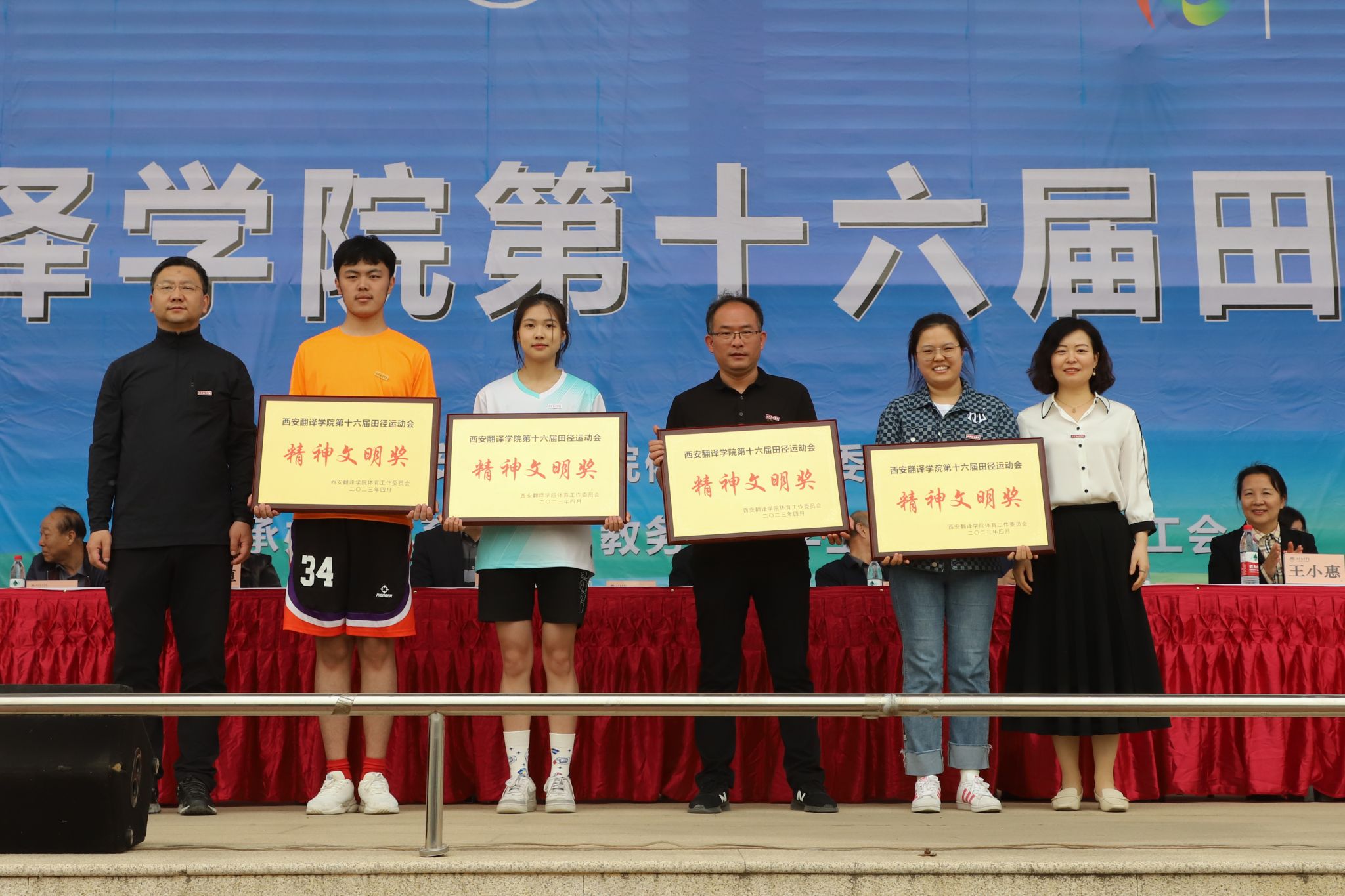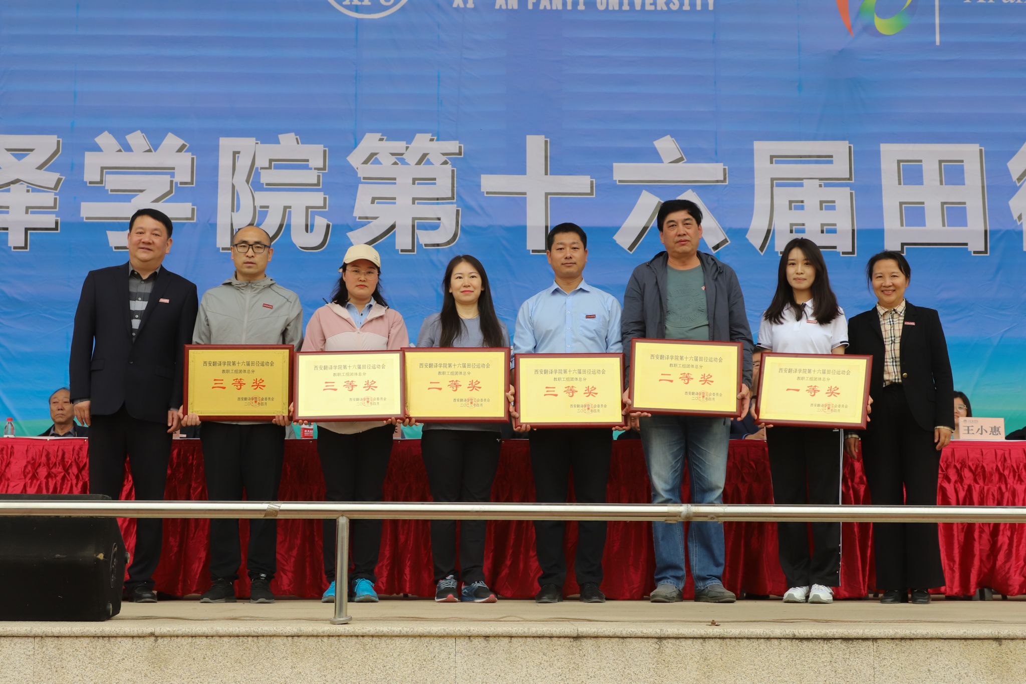 王小惠宣布运动会获奖名单。英文学院、国际商学院、教育学院获得体育道德风尚奖;校工会、学工部、教务处、信息工程学院、国际商学院、团委获得优秀组织奖;高级翻译学院、亚欧语言文化学院、艺术设计学院、护理与康复学院、文学与传媒学院获得精神文明奖;后勤集团、体育学院获得特殊贡献奖。我校领导为获奖运动员及团体颁奖,并合影留念。