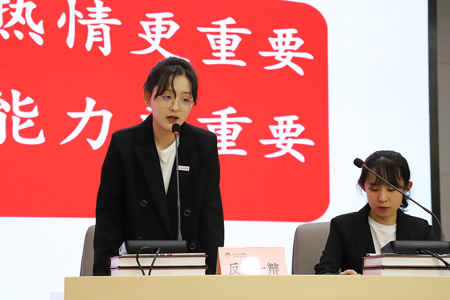 共有九支队伍入围辩论赛决赛。各队伍之间配合默契,辩手们唇枪舌剑、你来我往,经过三轮激烈角逐,文学与传媒学院、高级翻译学院、商学院三支队伍将争夺冠军席位。正方商学院围绕“知识的学习更适合社会竞争”展开辩论,反方文学与传媒学院以“品德的锤炼更适合社会竞争”为辩题,双方各抒己见,以清晰的语言表达与缜密的条理分析,充分展现出辩论艺术的无穷魅力,将比赛气氛推向高潮。文学与传媒学院四辨包焌洁凭借扎实的文学功底及稳定的现场发挥对对手存在的逻辑漏洞逐一击破,其辩论选题新颖、引经据典,内容富有深度、反应迅速敏捷,赢得现场观众阵阵掌声。最终,文学与传媒学院以94.33分夺得比赛桂冠。