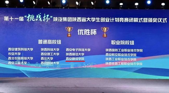 6月25日,由共青团陕西省委、中共陕西省委教育工委、陕西省人力资源和社会保障厅、陕西省科学技术协会、陕西省社会科学院、陕西省学生联合会、陕西省西咸新区开发建设管理委员会共同主办的第十一届“挑战杯”陕汽集团陕西省大学生创业计划竞赛在西安理工大学圆满落幕。我校学子在本届大赛中喜获金奖1项、银奖7项、铜奖1项,学校以历届最好成绩首次捧得省赛“优胜杯”,实现历史性突破,竞赛总成绩位列陕西民办高校第一。