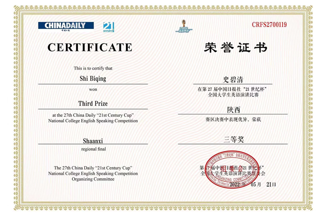 在5月21日结束的第27届中国日报社“21世纪杯”全国大学生英语演讲比赛省级决赛中,我校英文学院2020级英语专业学生闫可欣和2021级学生史碧清分别荣获省赛二等奖、三等奖的优异成绩。这是我校学子在此项赛事中取得的一项突破。