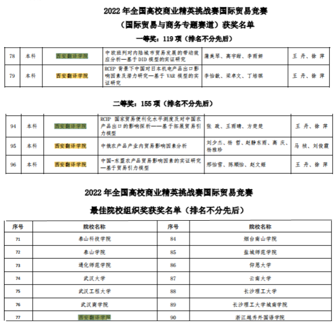 我校于2021年首次参赛就斩获一等奖。2022年,我校师生在充足的准备与复盘下,再获两个一等奖和三个二等奖,展现了我校国际经济与贸易国家级一流专业在人才培养方面的建设成果,也体现了参赛团队不怕吃苦、攻坚克难的精神。本次比赛也提升了国际经济与贸易专业学生的外贸洞察能力和论文写作素养。
