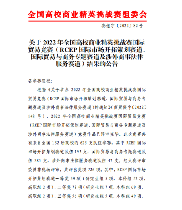 全国高校商业精英挑战赛国际贸易竞赛(商务专题竞赛)由中国国际贸易促进委员会主办,是教育部认定的国家级比赛,也是《全国普通高校大学生学科竞赛排行榜》中唯一的国际贸易专业赛事活动。经过多年的培育,全国高校商业精英挑战赛国际贸易竞赛业已发展成为我国国际经贸教育领域,基于校企合作的规模最大的综合实践平台和学科竞赛活动。参赛内容围绕国际经贸政策、国际贸易实务、国际营销、自贸协定(含RCEP)应用与研究等主题,洞察商业问题,攥写专题研究论文。该项赛事已举办十届,参赛团队有西北工业大学、江西财经大学等985高校,名校云集。此次竞赛共有来自全国132所高校的625支队伍参赛,其中国际贸易与商务专题赛道队385支。我校高度重视、认真组织,于6月份开始备赛,组建20支队伍,在老师的指导下精心选题、多渠道采集收集数据和认真攥写论文,10月份举办校级选拔赛,推选出5支队伍参加国赛。经过老师们的悉心指导,参赛团队对论文进行不断优化和完善,最终顺利夺得一等奖、二等奖和最佳院校组织奖。