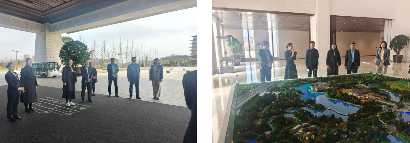 在企业工作人员的精心引导下,校方代表团首先参观了会议中心1号楼核心区域。这里作为中国—中亚峰会的重要举办场地,留存着众多重大外事活动的珍贵印记。工作人员现场细致讲解了中亚峰会举办期间的盛况与服务细节,重点介绍了麟德厅、建章厅等标志性会议厅的功能布局、设计理念及高端会议服务标准。麟德厅的敦煌元素水晶顶、建章厅融合唐代纹饰的穹顶设计,以及各场馆承接国际高端会议的专业配置,让校方成员直观感受到大型国际会议的服务要求与文化内涵,为后续人才培养与志愿服务对接奠定了直观认知基础。