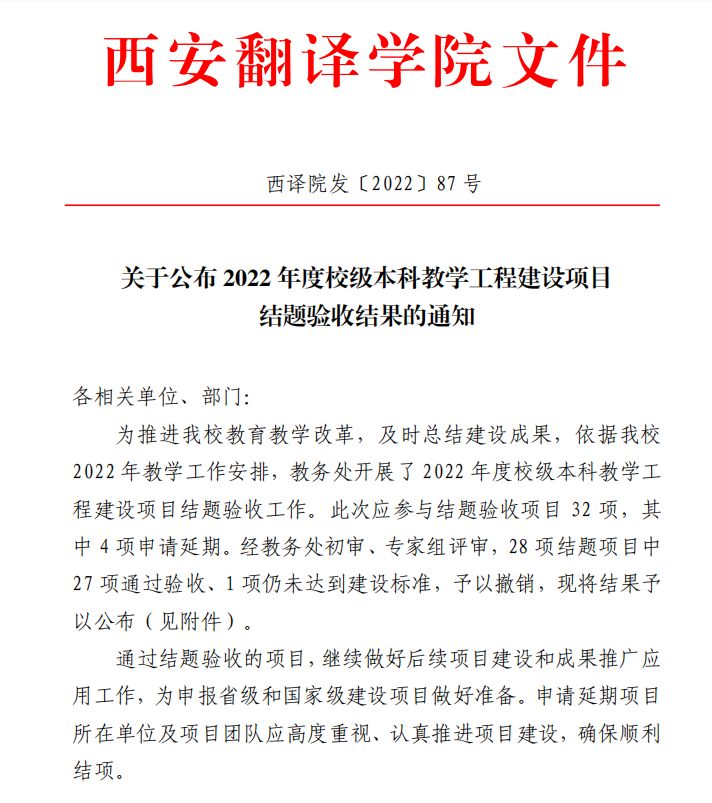 关于公布 2022 年度校级本科教学工程建设项目结题验收结果的通知