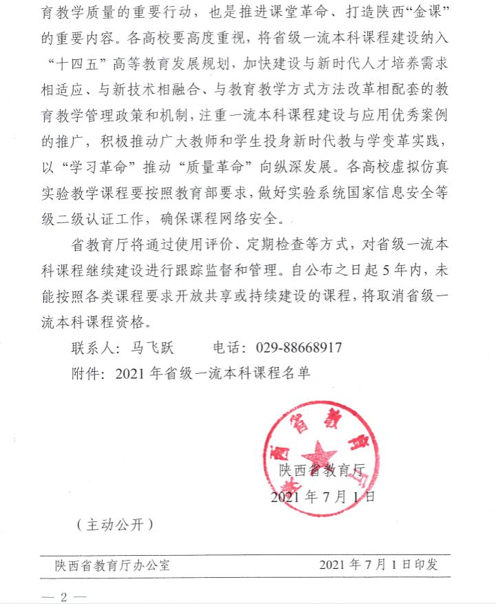 收转:《陕西省教育厅关于公布 2021年 省级一流本科课程认定结果的通知》