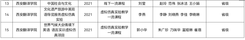 2021年7月1日,省教育厅公布了《关于对2021年度省级一流本科课程认定结果的通知》陕教〔2021〕107号,我校《国际贸易单证实务》等14门课程获批省级一流课程。其中,线上一流课程2门、线下一流课程3门、线上线下混合式一流课程6门、虚拟仿真实验教学一流课程2门和社会实践一流课程1门,获批总数量在全省同类院校中排名第一。另有《高级英语》等5门课程被省教育厅推荐参加国家级一流课程评选。