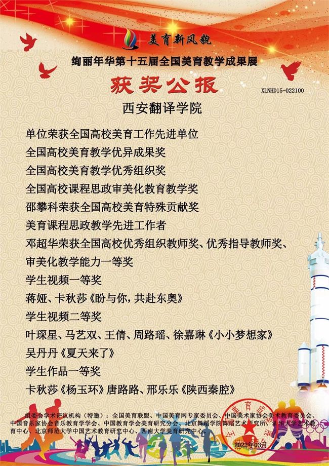 为贯彻落实习近平总书记关于美育的重要论述及全国教育大会精神,落实立德树人根本任务,弘扬中华美育精神,西安翻译学院组织师生积极参加“美育新风貌·绚丽年华”第十五届全国高校美育教学成果展。近日,从组委会传来捷报,西译师生在此次成果展中喜获佳绩。西安翻译学院荣获全国高校美育工作先进单位、全国高校美育教学优异成果奖、全国高校美育教学优秀组织奖、全国高校课程思政审美化教育教学奖。教师邵攀科荣获全国高校美育特殊贡献奖、美育课程思政教学先进工作者,邓超华荣获全国高校优秀组织教师奖、优秀指导教师奖、审美化能力一等奖。学生共有37件艺术作品获得荣誉,其中14个作品获得一等奖,17个作品获得二等奖,6个作品获得三等奖。